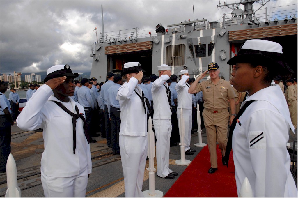 | 166k | 080818-N-8273J-331. Pearl Harbor, Hawaii, August 18 2008, Chief of Naval Operations (CNO) Adm. Gary Roughead is piped ashore after visiting with Sailors aboard the Arleigh Burke-class destroyer USS Chafee (DDG 90). Roughead and Master Chief Petty Officer of the Navy (MCPON) Joe R. Campa Jr. are completing a 10-day, around-the-world trip to visit Sailors, thank them for their contributions and hear their thoughts firsthand. U.S. Navy photo by Mass Communication Specialist 1st Class Tiffini M. Jones. | Robert M. Cieri |