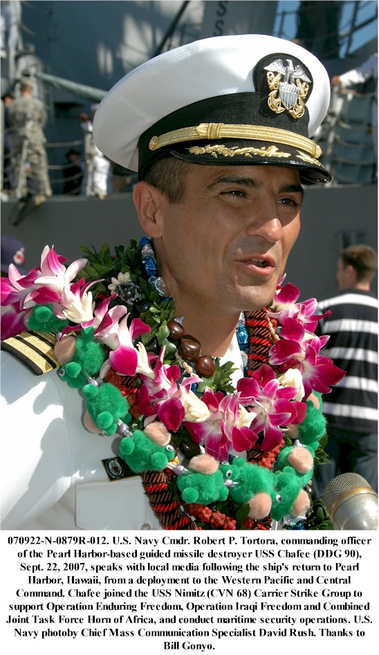 | 131k | 070922-N-XP363-012. Pearl Harbor, HI, September 22 2007, Cmdr. Robert P. Tortora, commanding officer of the Pearl Harbor-based guided-missile destroyer USS Chafee (DDG 90), speaks with local media following the ship's return from a deployment to the Western Pacific and Central Command. Chafee joined the USS Nimitz (CVN 68) Carrier Strike Group to support Operation Enduring Freedom, Operation Iraqi Freedom and Combined Joint Task Force Horn of Africa, and conduct maritime security operations. US Navy photo by Chief Mass Communication Specialist David Rush. | Robert M. Cieri |