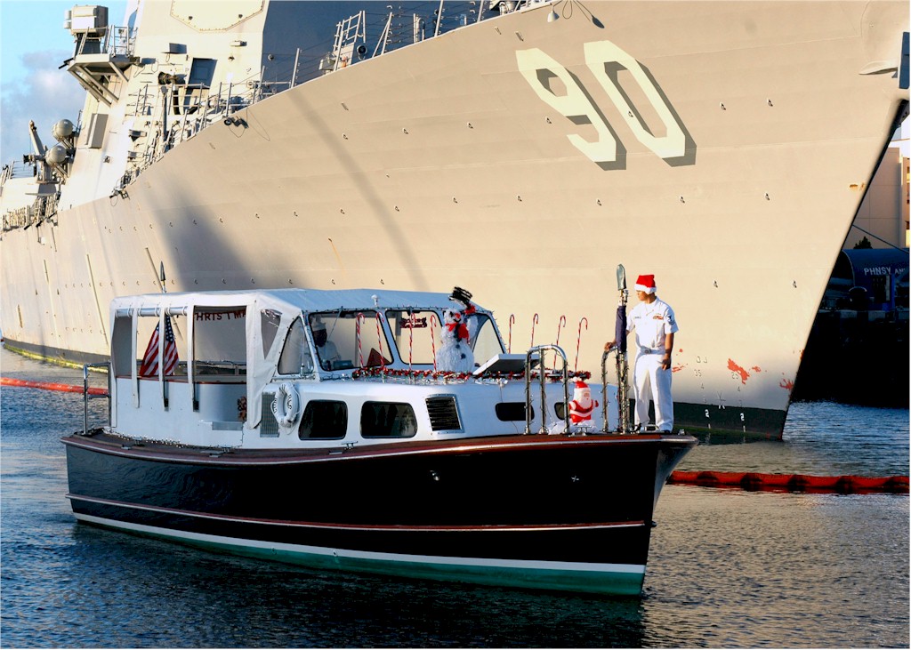 | 202k | 071220-N-1008D-020. Pearl Harbor, Hawaii, December 20 2007, the barge belonging to Naval Station Pearl Harbor's commanding officer passes guided missile destroyer USS Chafee (DDG 90). The barge is en route to pick up judges for the Pearl Harbor Naval Base annual holiday light-decorating contest. U.S. Navy photo by Ensign Theresa Donnelly. | Robert M. Cieri |