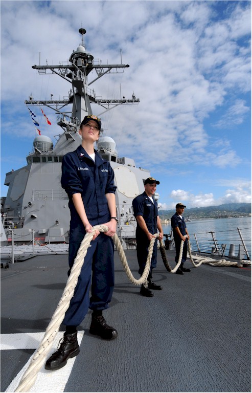 | 109k | 090112-N-0879R-003. Pearl Harbor, January 12 2009, sailors aboard the Pearl Harbor-based guided-missile destroyer USS Chafee (DDG 90) stow a mooring line as the ship heads to sea to conduct pre-deployment exercises in the Hawaiian operating area. U.S. Navy photo by Chief Mass Communication Specialist David Rush. | Robert M. Cieri |