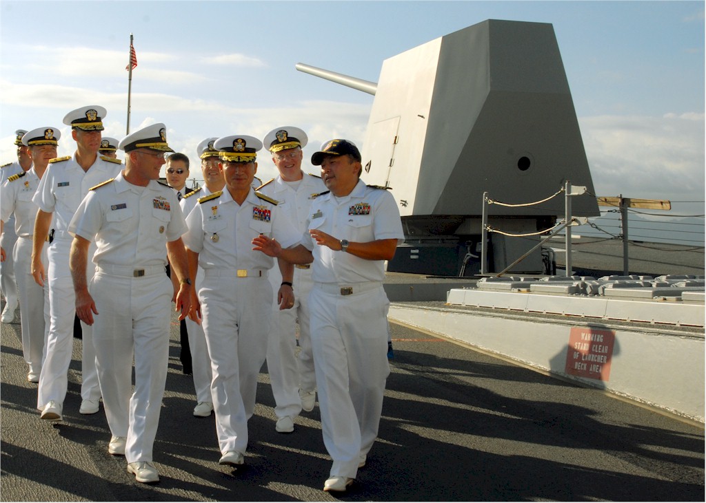 | 152k | 090109-N-5476H-103. Pearl Harbor, January 9 2009, Republic of Korea Navy Chief of Naval Operations Adm. Jung Ok-Keun, right, discusses various tactical scenarios and operations with Cmdr. Heedong Choi, commanding officer of the guided-missile destroyer USS Chafee (DDG 90). Jung visited various military installations throughout Hawaii to enhance mutual interest in maritime security and stability and build upon mutual trust and understanding. (U.S. Navy photo by Mass Communication Specialist 1st Class Michael Hight. | Bill Gonyo |