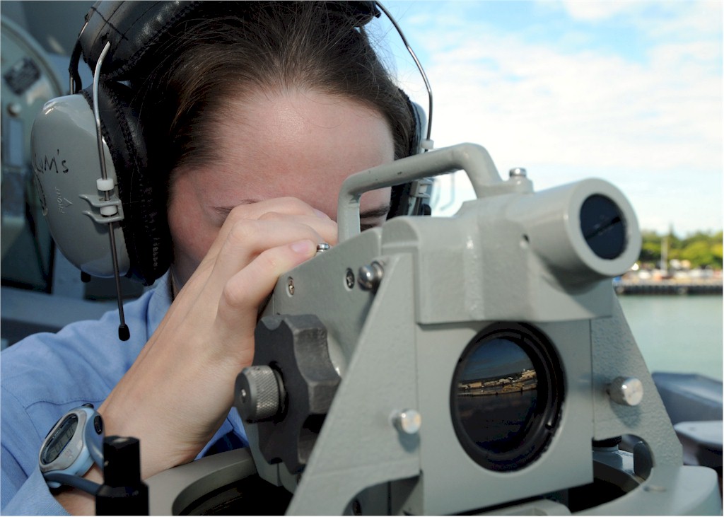 | 133k | 090112-N-0879R-002. Pearl Harbor, January 12 2009, Operations Specialist 3rd Class Cassandra Roper stands starboard bridge watch aboard the Pearl Harbor-based guided-missile destroyer USS Chafee (DDG 90) as the ship heads to sea to conduct pre-deployment exercises in the Hawaiian operating area. U.S. Navy photo by Chief Mass Communication Specialist David Rush. | Robert M. Cieri |