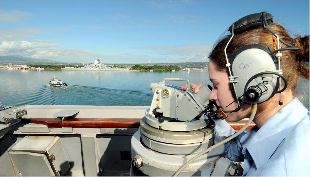 | 145k | 090112-N-0879R-004. Pearl Harbor, Hawaii, January 12 2009, Operations Specialist 3rd Class Cassandra Roper stands starboard bridge watch aboard the Pearl Harbor-based guided missile destroyer USS Chafee (DDG 90) as the ship leaves for pre-deployment exercises in the Hawaiian operating area. The USS Missouri Memorial is in the background. U.S. Navy photo by Chief Mass Communication Specialist David Rush. | Robert M. Cieri |