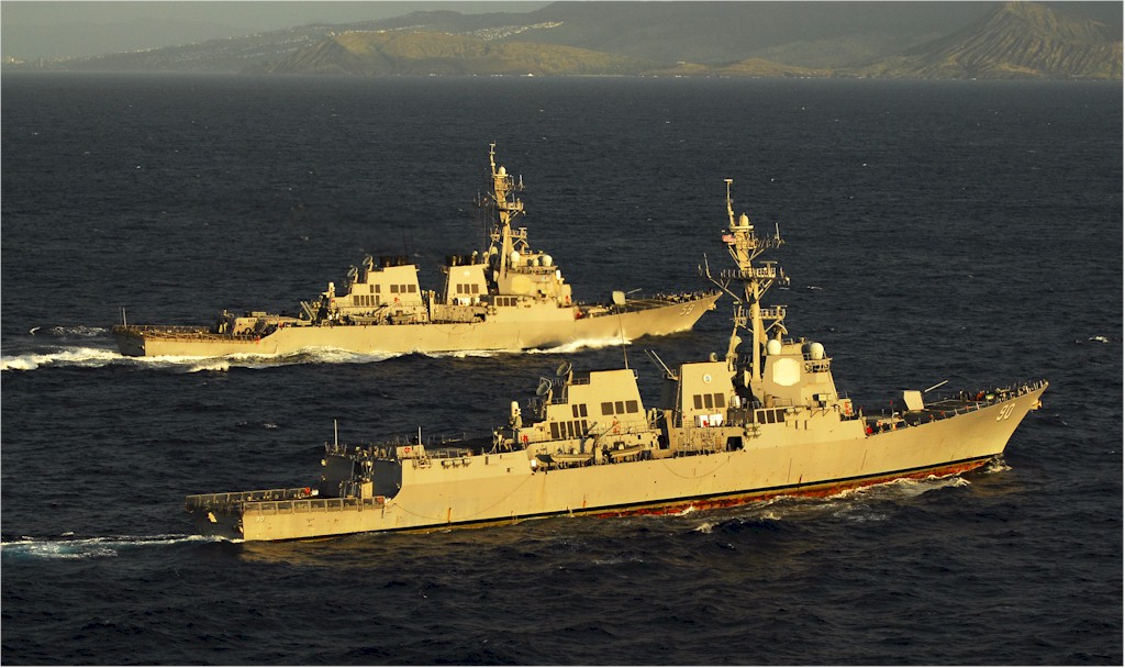 | 169k | 110405-N-WP746-085. Pearl Harbor, HI, April 5 2011, the guided-missile destroyers USS Chafee (DDG 90), foreground, and USS Russell (DDG 59) steam in formation in the Pacific Ocean near the island of Oahu, Hawaii. Hawaii-based surface ships and other combatant units were participating in Koa Kai 11-2, an integrated training event with the goal of attaining deployment certification and training. US Navy photo by Mass Communication Specialist 2nd Class Mark Logico. | Robert M. Cieri |