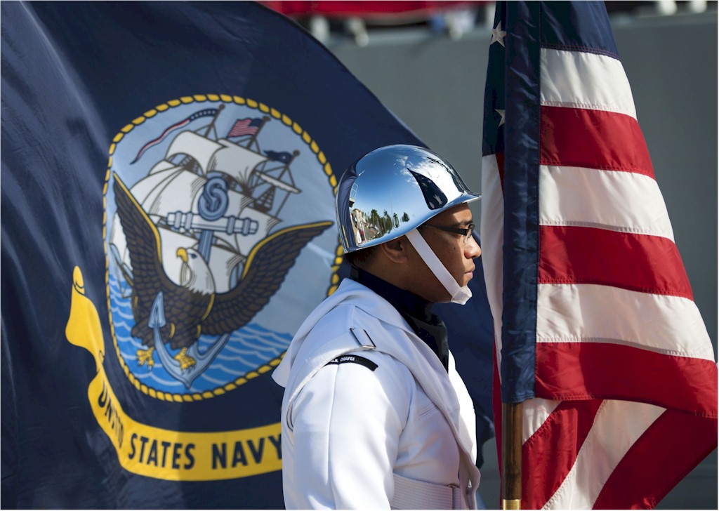 | 152k | 141125-N-WF272-021. Pearl Harbor, November 25 2014, Culinary Specialist 3rd Class Posini Farani parades the colors during a change of command ceremony for the guided-missile destroyer USS Chafee (DDG 90) at Joint Base Pearl Harbor-Hickam. Cmdr. Shea Thompson relieved Cmdr. Anthony Littmann of command of Chafee. U.S. Navy photo by Mass Communication Specialist 2nd Class Diana Quinlan. | Ron Reeves |