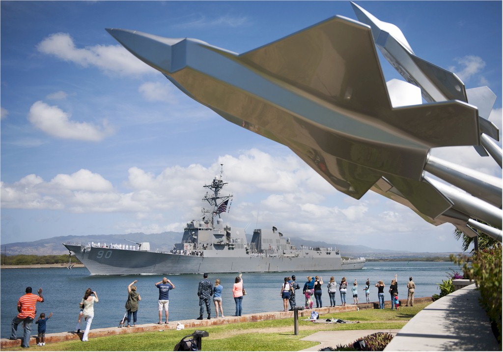 | 132k | 080607-N-4965F-164. Pearl Harbor, Hawaii, June 7 2008, the Arleigh Burke-class guided-missile destroyer USS Chafee (DDG 90) passes the Battleship Missouri Memorial as she makes her way pier side to Naval Station Pearl Harbor after a four-month deployment. U.S. Navy photo by Mass Communication Specialist 1st Class James E. Foehl. | Robert M. Cieri/Bill Gonyo |