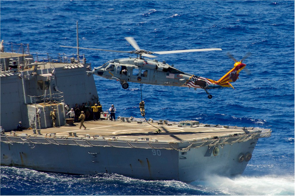 | 244k | 150728-N-YB023-291. Pacific Ocean, July 28 2015, sailors assigned to Explosive Ordnance Disposal Mobile Unit (EODMU) 5, embarked aboard the aircraft carrier USS George Washington (CVN 73), perform a helicopter rope suspension technique exercise in an MH-60S Sea Hawk helicopter assigned to the Golden Falcons of Helicopter Sea Combat Squadron (HSC) 12 during a visit-board-search and seizure drill aboard the Arleigh Burke-class guided-missile destroyer USS Chafee (DDG 90). U.S. Navy photo by Mass Communication Specialist Seaman Clemente A. Lynch. | Ron Reeves |