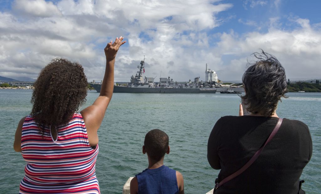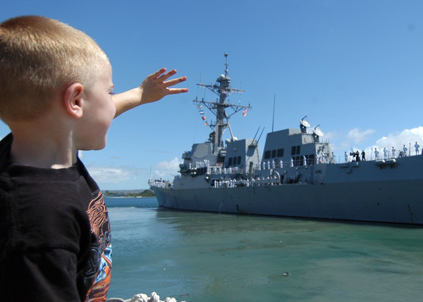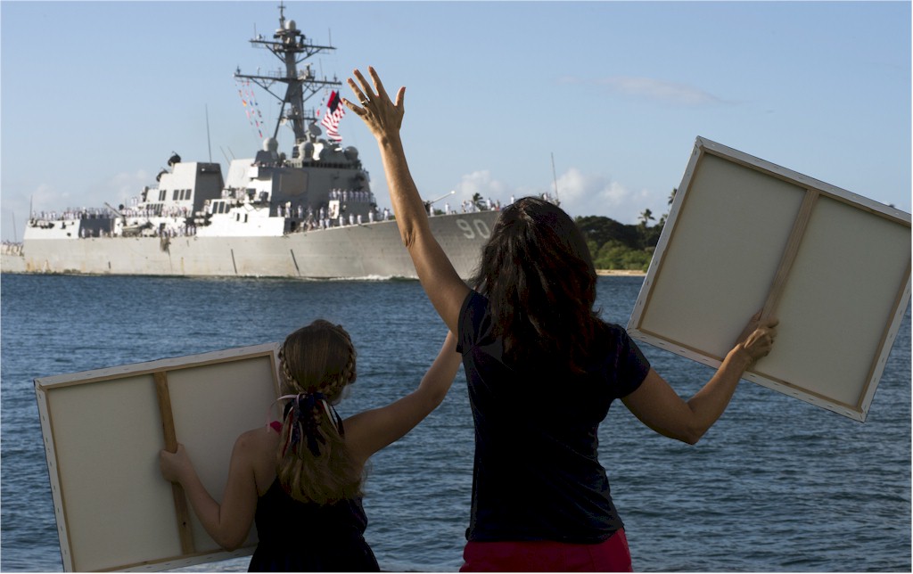 | 120k | 151217-N-GI544-161. Pearl Harbor, December 17 2015, Kiley Murphy and Lisa Murphy wave to the Sailors aboard the guided-missile destroyer USS Chafee (DDG 90) as the ship makes its return to Joint Base Pearl Harbor-Hickam after a seven-month independent deployment in the U.S. 3rd, 4th and 7th Fleet areas of operations. U.S. Navy photo by Mass Communication Specialist 2nd Class Laurie Dexter. | Ron Reeves |