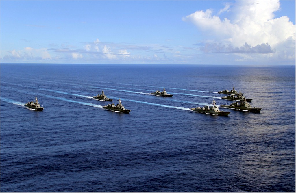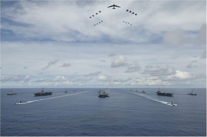 | 67k | Pacific Ocean, August 14 2007, Nimitz (CVN-68), Kitty Hawk (CV-63) and John C. Stennis (CVN-74) Carrier Strike Groups transit in formation during a joint photo exercise (PHOTOEX) during Valiant Shield 2007, the largest joint exercise in the Pacific this year. Held in the Guam operating area, Valiant Shield 2007 included 30 ships, more than 280 aircraft and more than 20,000 service members from the Navy, Air Force, Marine Corps, and Coast Guard. The aerial formation, led by an Air Force B-52 Stratofortress, consists of aircraft from the carrier strike groups as well as Air Force aircraft. Ships are, left to right: guided missile destroyer USS Chafee (DDG-90); nuclear-propelled aircraft carrier USS Nimitz (CVN-68), followed by the guided missile cruiser USS Princeton (CG-59) and the guided missile destroyers USS John Paul Jones (DDG-53) and USS Pinckney (DDG-91); nuclear-propelled attack submarine USS Hampton (SSN-767); aircraft carrier USS Kitty Hawk (CV-63), followed by the guided missile cruiser USS Cowpens (CG-63) and guided missile destroyer USS Mustin (DDG-89); nuclear-propelled attack submarine USS Key West (SSN-722); nuclear-propelled aircraft carrier USS John C. Stennis (CVN-74), followed by the guided missile cruiser USS Antietam (CG-54) and the guided missile destroyers USS Preble (DDG-88) and USS O'Kane (DDG-77); the Arleigh Burke-class guided missile destroyer on the extreme right has not been positively identified, but is possibly USS Paul Hamilton (DDG-60). | Fabio Peña |