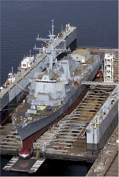 | 72k | Date unknown. The Aegis guided missile destroyer Pinckney (DDG 91) rests on the floating drydock at the Pascagoula, Miss., facility of Northrop Grumman Corporation's Ship Systems sector. Pinckney is the 19th Aegis destroyer built for the U.S. Navy by Northrop Grumman Ship Systems. | Fred Weiss |