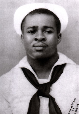 | 32k | Navy Cook First Class William Pinckney (1915-1975) received the Navy Cross for his courageous rescue of a fellow crew member onboard the USS Enterprise (CV 6) during the Battle of Santa Cruz. When an explosion killed four of the six men at his battle station in an ammunition handling room, Pinckney and the other surviving sailor attempted to exit through a hatch to the hangar deck above. When the other man grasped the scorching hatch, he fell back unconscious. Despite the suffocating smoke, flames, and gasoline fumes surrounding him, Pinckney carried the sailor to safety. For his selfless heroism, Pinckney was awarded the Navy Cross. | Steven A. Cardali |