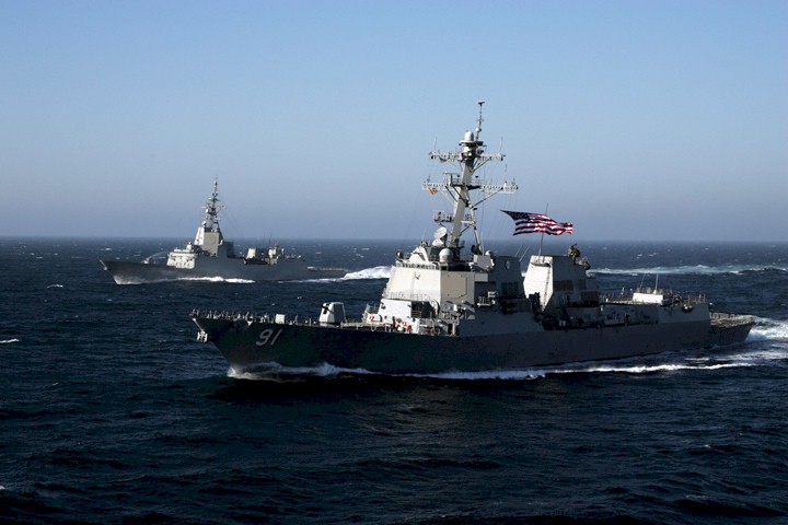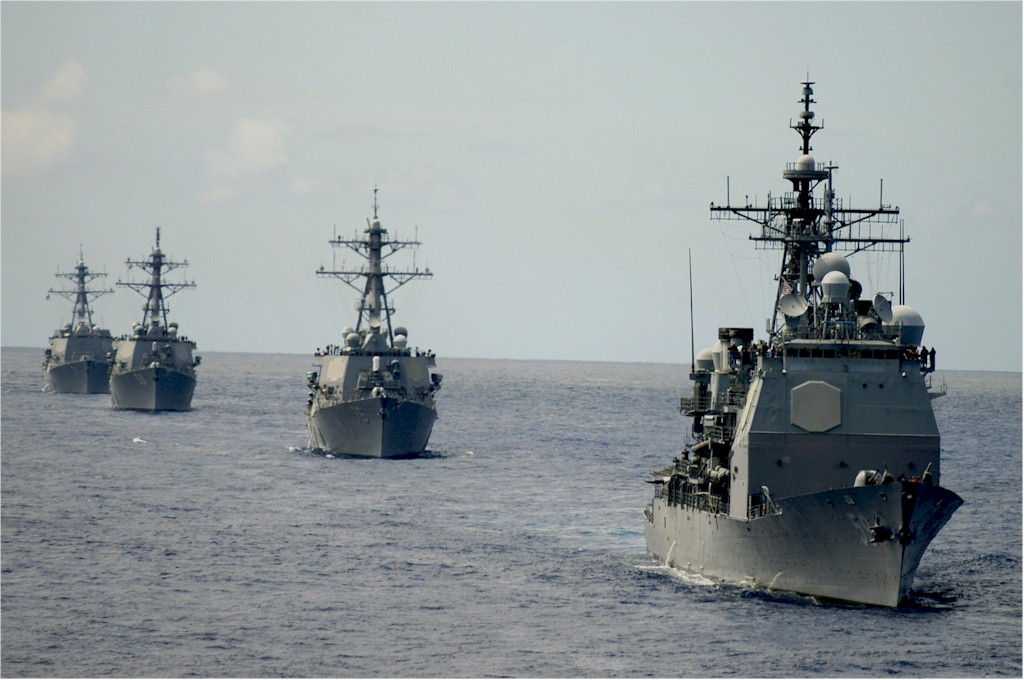 | 156k | 120222-N-OY799-186 Pacific Ocean, February 22 2012, the guided-missile destroyer USS Dewey (DDG 105) leads the guided-missile destroyers USS Kidd (DDG 100), USS Pinckney (DDG 91) and USS Wayne E. Meyers (DDG 108), all part of the USS John C. Stennis Carrier Strike Group, during an air power demonstration. The John C. Stennis Carrier Strike Group was under way in the U.S. 3rd Fleet area of operations while on a seven-month deployment. U.S. Navy photo by Mass Communication Specialist 3rd Class Kenneth Abbate, USN. | Robert M. Cieri |