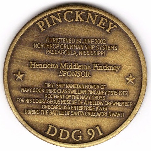 | 72k | 040810-N-0000X-001. Pacific Missile Test Center Range August 10 2004, the guided missile destroyer USS Pinckney (DDG 91) and the Spanish Navy frigate Almirante Juan De Borbon (F 102) sail together during Combat Systems Ship Qualifications Trials on the Pacific Missile Test Center Range. Pinckney is the first ship in the Navy named after Navy Cook 3rd Class William Pinckney, recipient of the Navy Cross for his courageous rescue of a fellow crew member aboard the aircraft carrier USS Enterprise (CV 6) during the Battle of Santa Cruz. U.S. Navy Photo by Gregory N. Senff. | Bill Gonyo |