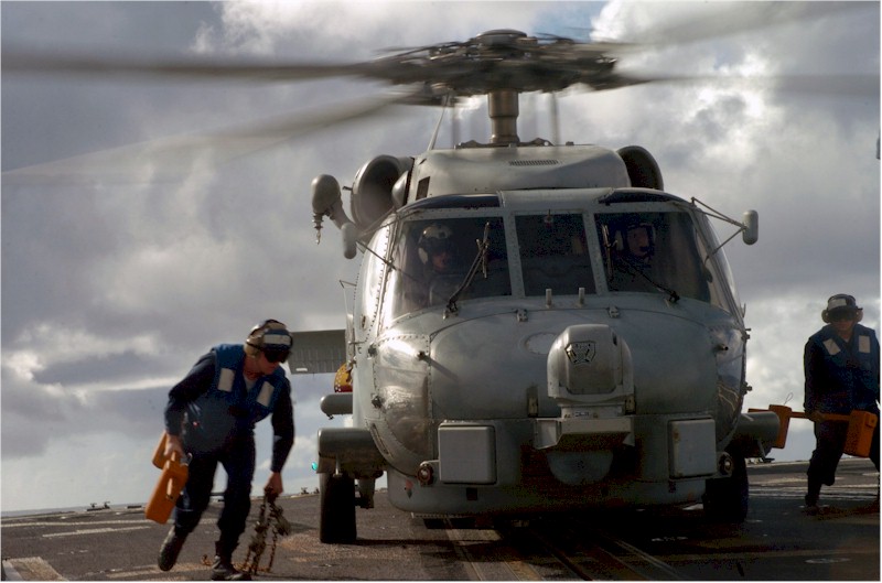 | 87k | 070909-N-4420S-021. Pacific Ocean, August 9 2007, Boatswain's Mate Seaman Marshall Loyson and Boatswain's Mate Seaman Chad Carganilla remove the chalks and chains from an SH-60B Seahawk, assigned to the "Scorpions" of Helicopter Anti-submarine Squadron Light (HSL) 49, before taking off from the deck of the guided-missile destroyer USS Pinckney (DDG 91). Pinckney is deployed with the Nimitz Carrier Strike Group participating in Valiant Shield 2007. VS07, the largest joint exercise in recent history, includes 30 ships, more than 280 aircraft, and more than 20,000 service members from the Navy, Marines Corps, Air Force and Coast Guard. U.S. Navy photo by Mass Communication Specialist Seaman John Scorza | Robert M. Cieri |