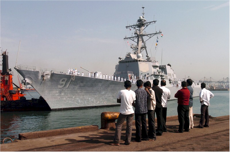 | 102k | 070702-N-4420S-098. Chennai, India, July 2 2007, residents from India watch as Sailors aboard guided-missile destroyer USS Pinckney (DDG 91) man the rails while entering port. Pinckney is the escort for nuclear-powered aircraft carrier USS Nimitz (CVN 68), the first nuclear-powered aircraft carrier to visit India. Nimitz and Carrier Strike group 11 are currently operating in the Pacific and Indian Oceans as part of the U.S. 7th Fleet. U.S. Navy photo by Mass Communication Specialist Seaman Apprentice John Scorza. | Robert M. Cieri |