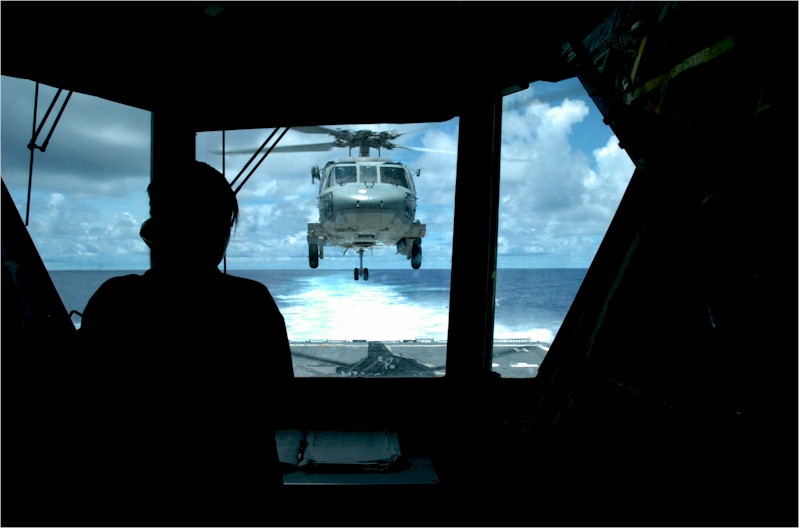 | 54k | 070809-N-4420S-020. Pacific Ocean, August 9, 2007, Storekeeper 1st Class Tobi Giangiulio helps guide in a SH-60B Seahawk helicopter for landing aboard the guided-missile destroyer USS Pinckney (DDG 91). Pinckney is deployed in the U.S. 7th Fleet participating in Valiant Shield 2007 (VS07). VS07, the largest joint exercise in recent history, includes 30 ships, more than 280 aircraft, and more than 20,000 service members from the Navy, Marines Corps, Air Force and Coast Guard. U.S. Navy photo by Mass Communication Specialist Seaman John Scorza. | Robert M. Cieri |