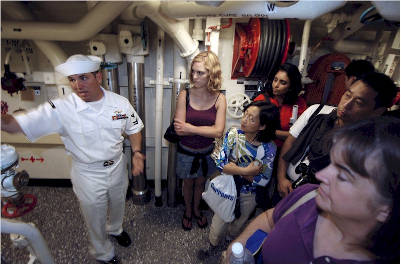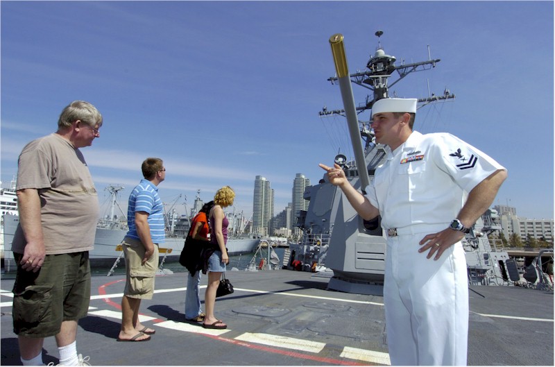 | 116k | 060930-N-8273J-071. San Diego, September 30 2006, Cryptologic Technician (Technical) 2nd Class Josh Emery conducts a tour of guided-missile cruiser USS Pinckney (DDG 91) during San Diego’s Fleet Week. The tour allowed guests a chance to see how Sailors work and live while at sea. Fleet Week's mission is to pay tribute and thank local military servicemen and women for "Serving America Twice" in the defense of our nation and as volunteers in improving the quality of our communities. U.S. Navy photo by Mass Communication Specialist 2nd Class Tiffini M. Jones. | Robert M. Cieri |