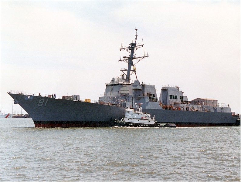 | 143k | Port bow view of the USS Pinckney (DDG 91) being assisted by a commercial tug boat as it arrives at the fitting out pier at the Northrop Grumman Ingalls Shipyard, Pascagoula, Mississippi on 26 June 2002. Ingalls Shipbuilding Photo. ID# DN-SD-04-09079. | Robert M. Cieri |