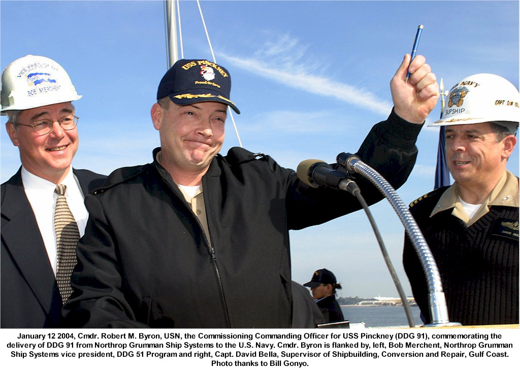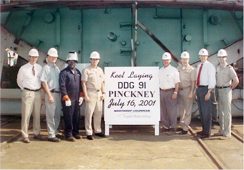 | 136k | Participants at the official keel laying ceremony for the Arleigh Burke class guided missile destroyer USS Pinckney (DDG 91) on 16 July 2001. Left to Right: Mr. Bob Merchant, AEIS Program Manager, Ingalls Shipbuilding; Mr. Jerald Read, Ship Superintendent, Northrop Grumman Ingalls Shipbuilding; Mr. Mike Ikner, welder, Ingalls Shipyard; Commander Steve Metz, US Navy (USN), Area Commander/Destroyer Project Officer; Mr. Paul Robinson, Vice President Operations Ingalls Shipbuilding; Captain Philip M. Johnson, USN, Senior Vice President, Northrop Grumman Ship Systems Sector; Lieutenant Commander Derek Sims, USN, Production Officer, SuShip Pascagoula Code 150P. Ingalls Shipbuilding Photo. ID# DN-SC-02-05483. | Robert M. Cieri |