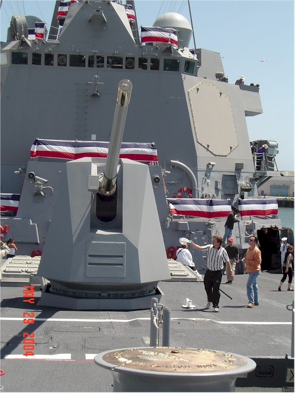 | 99k | 060930-N-8273J-065. San Diego, September 30 2006, Cryptologic Technician (Technical) 2nd Class Josh Emery conducts a tour of guided-missile cruiser USS Pinckney (DDG 91) during San Diego’s Fleet Week. The petty officer is describing the capabilities of the ship's 5" gun-mount. U.S. Navy photo by Mass Communication Specialist 2nd Class Tiffini M. Jones. | Robert M. Cieri |