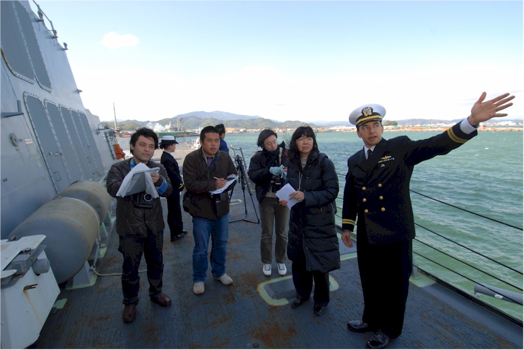 | 140k | 100228-N-3283P-078. Tokushima, Japan, February 28 2010, Lt. Jesse Maynor, chief engineer aboard the guided-missile destroyer USS Pinckney (DDG 91), explains the ship's capabilities to members of the Japanese media during a tour of the ship. Pinckney is conducting operations in the U.S. 7th Fleet area of responsibility. U.S. Navy photo by Mass Communication Specialist 3rd Class Dominique Pineiro. | Robert M. Cieri |
