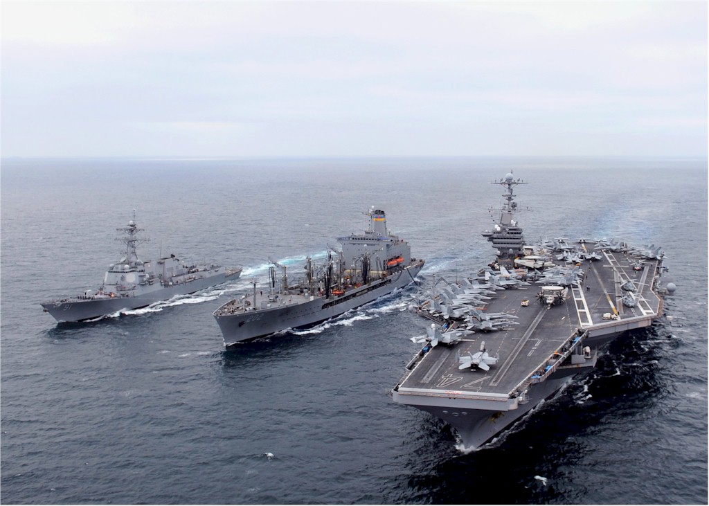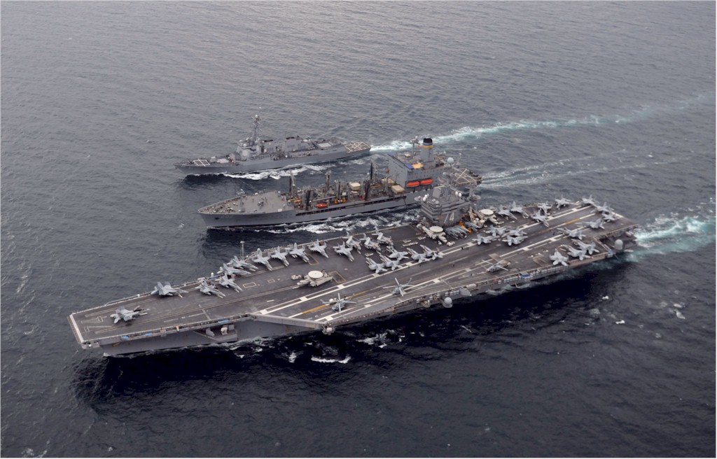 | 156k | 110512-N-JI215-159. Pacific Ocean, May 12 2011, from the left, the guided-missile destroyer USS Pinckney (DDG 91), fleet replenishment oiler USNS Yukon (T-AO 202) and the aircraft carrier USS John C. Stennis (CVN 74) steam alongside each other during a replenishment at sea (RAS). Stennis was participating in a composite training unit exercise off the coast of SoCal. US Navy photo by Mass Communication Specialist 3rd Class Timothy Aguirre. | Robert M. Cieri |
