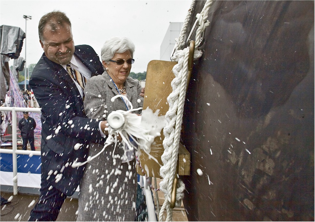 | 221k | 100605-N-0000G-002. Bath, Maine, June 5 2010, Ellen Spruance Holscher and an unidentified man break a bottle of Champaign to christen the guided-missile destroyer Pre-Commissioning Unit (PCU) Spruance (DDG 111), during a ceremony at General Dynamics Bath Iron Works in Bath, Maine. Holscher is the ship's sponsor. Spruance is named after Holscher's grandfather, Adm. Raymond A. Spruance, the U.S. Navy commander at the Battle of Midway, fought June 4-7, 1942. Photo courtesy of General Dynamics Bath Iron Works by D. Griggs. | Bill Gonyo |