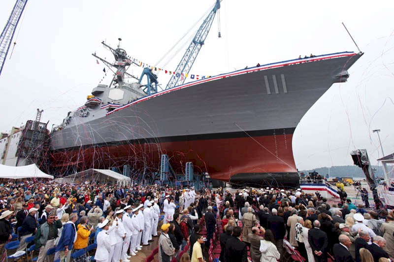 | 221k | Bath, Maine, June 5 2010, the guided-missile destroyer Pre-Commissioning Unit (PCU) Spruance (DDG 111) displays her best as visitors celebrates after christening the ship at a ceremony at General Dynamics Bath Iron Works in Bath, Maine. The ship is named after Adm. Raymond A. Spruance, the U.S. Navy commander at the Battle of Midway, fought June 4-7, 1942. Photo courtesy of General Dynamics Bath Iron Works. | Bill Gonyo |