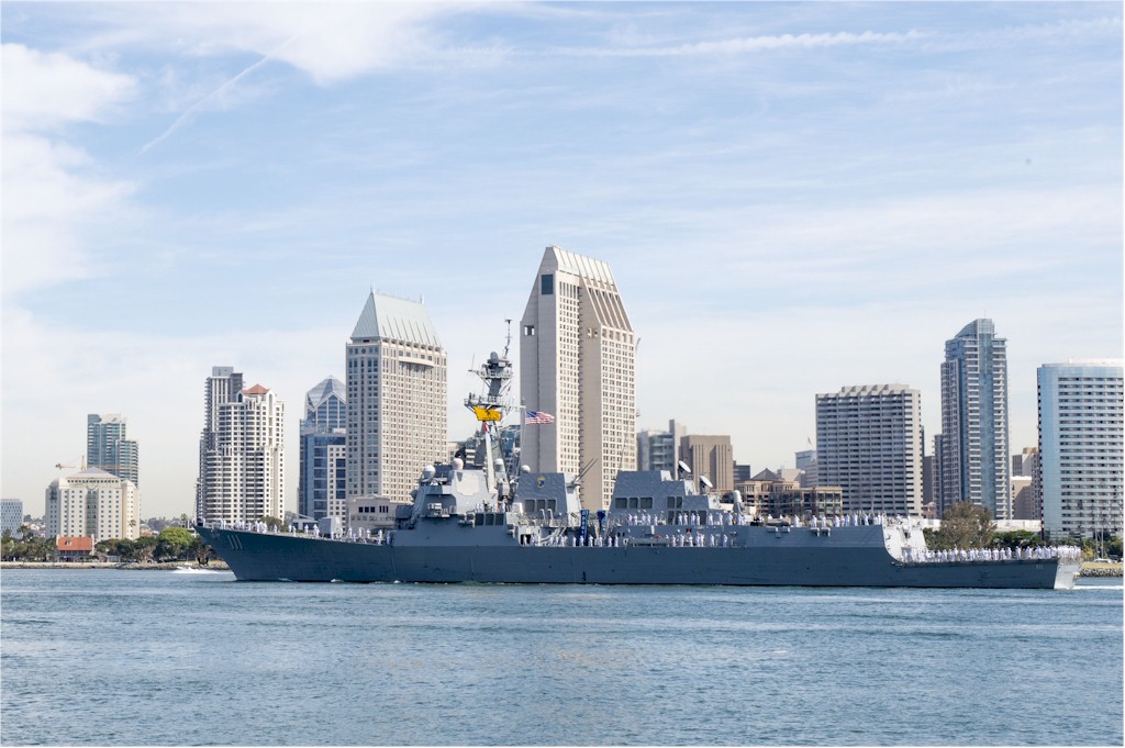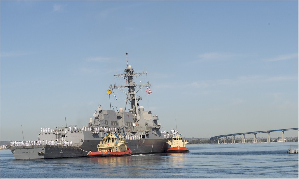 | 94k | 160419-N-RM689-214. San Diego, April 19 2016, USS Spruance (DDG 111) departs Naval Base San Diego for a scheduled deployment to the Western Pacific as part of Commander, U.S. Third Fleet Pacific Surface Action Group (PAC SAG). Spruance, along with guided missile destroyers USS Decatur (DDG 73) and USS Momsen (DDG 92) and embarked "Devil Fish" and "Warbirds" detachments of Helicopter Maritime Strike Squadron (HSM) 49, will deploy as part of PAC SAG under Destroyer Squadron 31 (CDS-31). U.S. Navy photo by Mass Communication Specialist Seaman Kelsey L. Adams. | Ron Reeves |