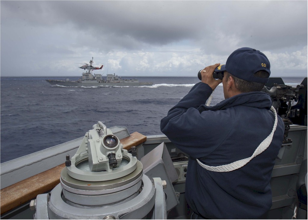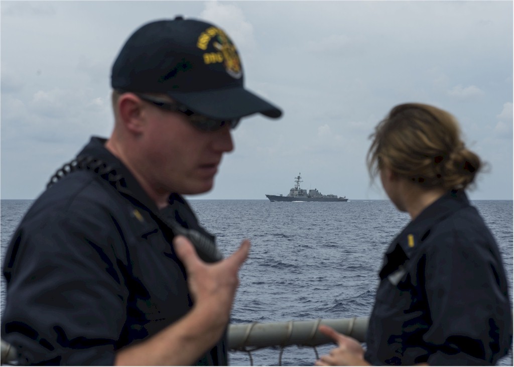 | 103k | 160730-N-SU278-145. South China Sea, July 30 2016, Ens. Shawn Kavanaugh, left, and Ens. Samantha DaSilva, assigned to the guided-missile destroyer USS Spruance (DDG 111), look on as the guided-missile destroyer USS Momsen (DDG 92) approaches. Spruance and Momsen, along with the guided-missile destroyer USS Decatur (DDG 73), are deployed in support of maritime security and stability in the Indo-Asia-Pacific as part of a U.S. 3rd Fleet Pacific Surface Action Group (PAC SAG) under Commander, Destroyer Squadron (CDS) 31. U.S. Navy photo by Mass Communication Specialist 2nd Class Will Gaskill. | Ron Reeves |