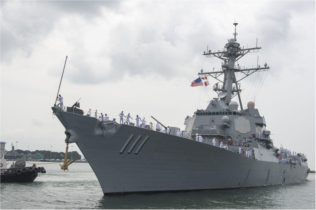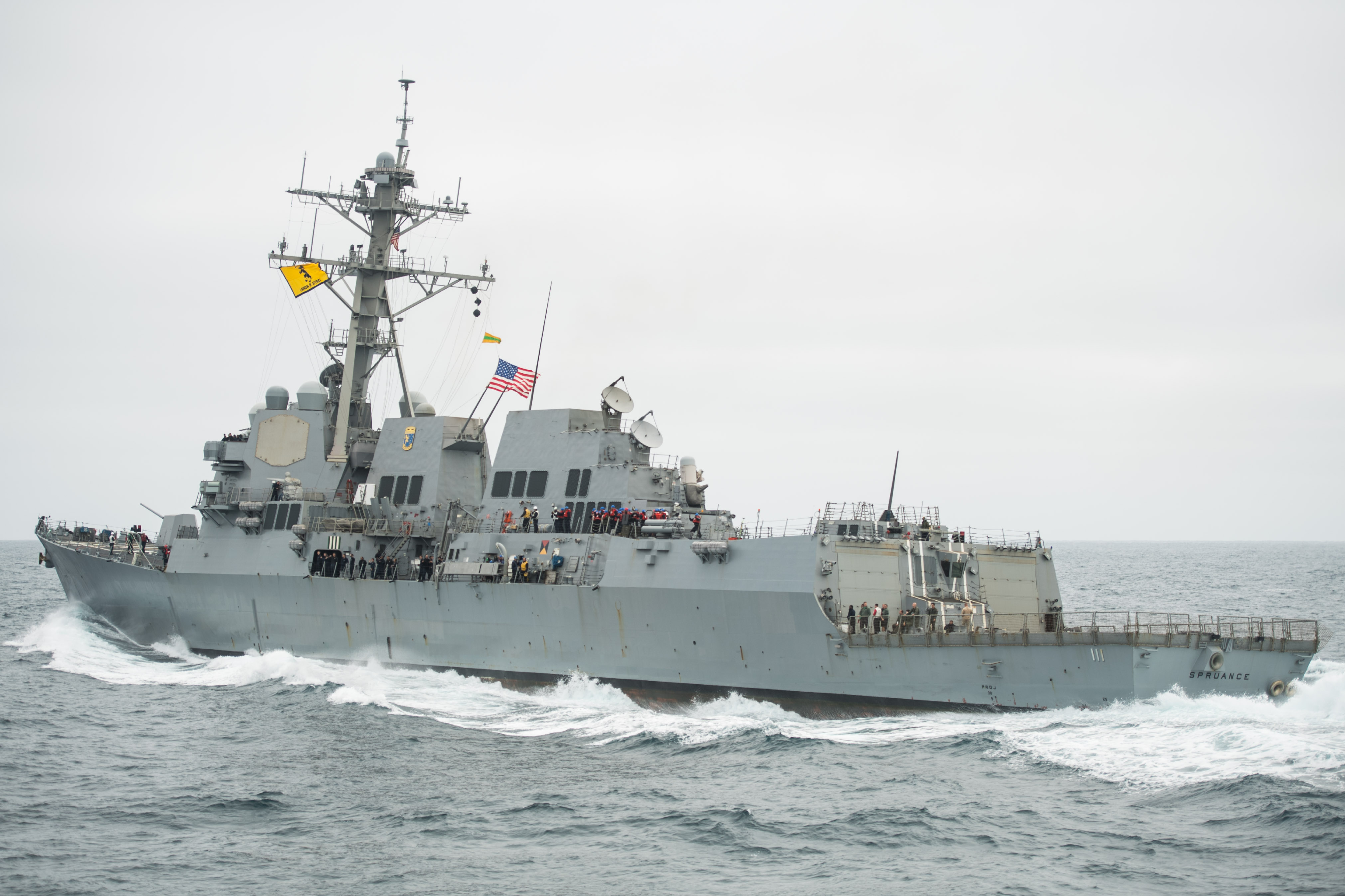 | 109k | 160702-N-OU129-108. Singapore, July 2 2016, the guided-missile destroyer USS Spruance (DDG 111) arrives at Changi Naval Base in Singapore July 2, 2016. Spruance is deployed in support of maritime security and stability in the Indo-Asia Pacific as part of a U.S. 3rd Fleet Pacific Action Group (PAC SAG) under Commander, Destroyer Squadron 31. U.S. Navy photo by Mass Communication Specialist 2nd Class Joshua Fulton. | Ron Reeves |