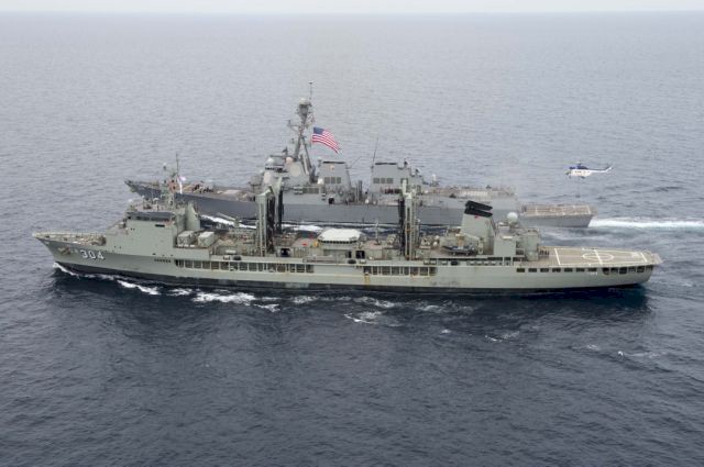 | 60k | 160727-N-SU278-293. South China Sea, July 27 2016, the guided-missile destroyer USS Spruance (DDG 111) takes on fuel from the Australian oiler HMAS Success (OR 304) while a Super Puma helicopter assigned to the U.S. Military Sealift Command USNS Matthew Perry (T-AKE 9), not pictured, transfers stores between the three ships during a refueling at sea. Spruance, along with the guided-missile destroyers USS Momsen (DDG 92) and USS Decatur (DDG 73), are deployed in support of maritime security and stability in the Indo-Asia-Pacific as part of a U.S. 3rd Fleet Pacific Surface Action Group (PAC SAG) under Commander, Destroyer Squadron (CDS) 31. U.S. Navy photo by Mass Communication Specialist 2nd Class Will Gaskill. | Ron Reeves |