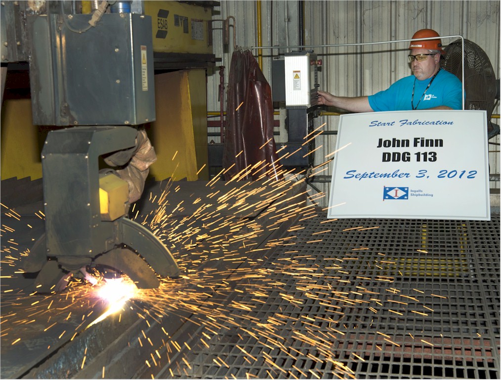 | 248k | Ingalls Shipbuilding burner specialist Roland Wilson uses an Avenger III Plasma Cutter to cut patterns into steel, marking start of fabrication for the Aegis guided missile destroyer John Finn (DDG 113). A Monday ceremony at Ingalls acknowledged the actual start of fabrication on September 3 2012. Photo courtesy of Huntington Ingalls Industries, Inc. | Bill Gonyo |