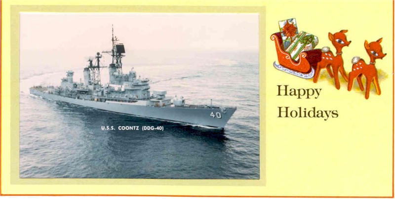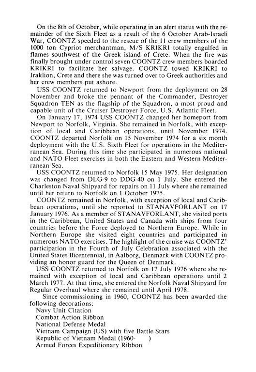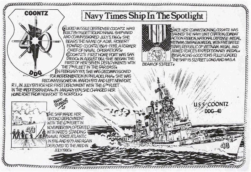 | 148k | USS Coontz (DDG-40) Letterpress reproduction of a photograph showing the ship underway in the Atlantic, off the Virginia coast, October 1986. Official U.S. Navy Photograph, from the collections of the Naval Historical Center. | Fred Weiss | |