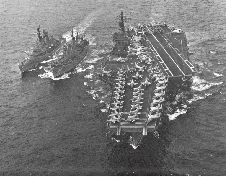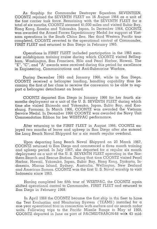 116k | USS Coontz flight deck with USS Constellation in the background, July 1969. Naval Aviation News, November 1969 photograph. | EMC(SW) Brian Kroenung | |