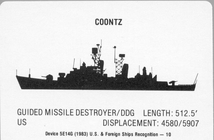31k | Recognition Study Card for the USS Coontz. It came from "U.S. and FOREIGN SHIPS" Device 5E14G. LSN 6910-LL-C00-6462. | Brian N. Kroenung II EMC(SW) | |