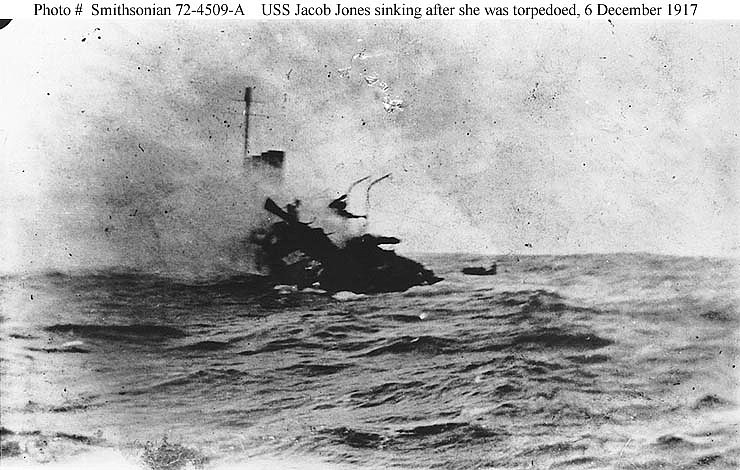 111k | USS Jacob Jones (Destroyer # 61) sinking off the Scilly Islands, England, on 6 December 1917, after she was torpedoed by the German submarine U-53. Photographed by Seaman William G. Ellis. Smithsonian Institution Photograph. | Fred Weiss |