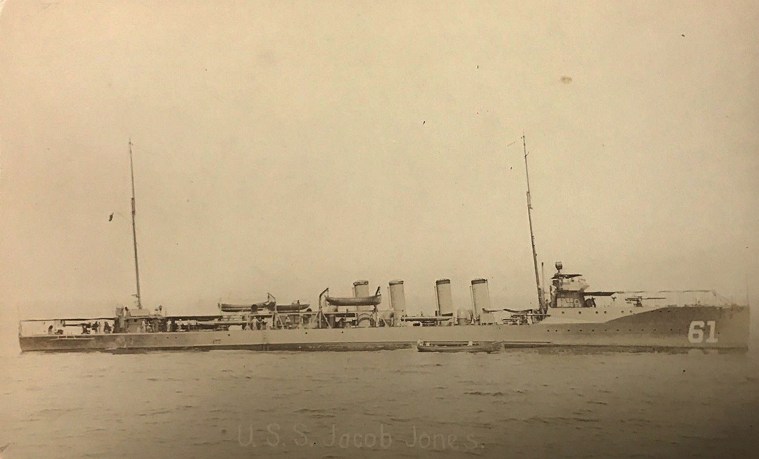 101k | USS Jacob Jones (Destroyer # 61) Ship's survivors following their rescue. Jacob Jones was sunk off the Scilly Isles by the German submarine U-53, on 6 December 1917. Courtesy of Commander Donald J. Robinson, USN (Retired), 1981. U.S. Naval Historical Center Photograph. | Fred Weiss |