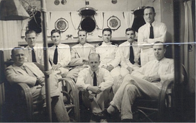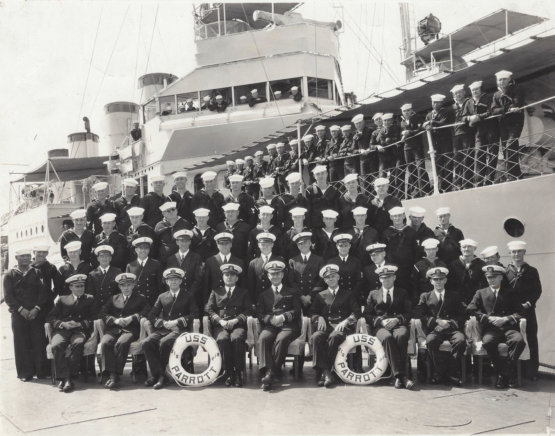 497k | Portrait of Parrott and her crew at Shanghai, China, 1932. Fred Marut is on the ship's railing, sixth from the right. | Robert Marut in memory of his father CWO3 Fred L. Marut USN (Ret.) |