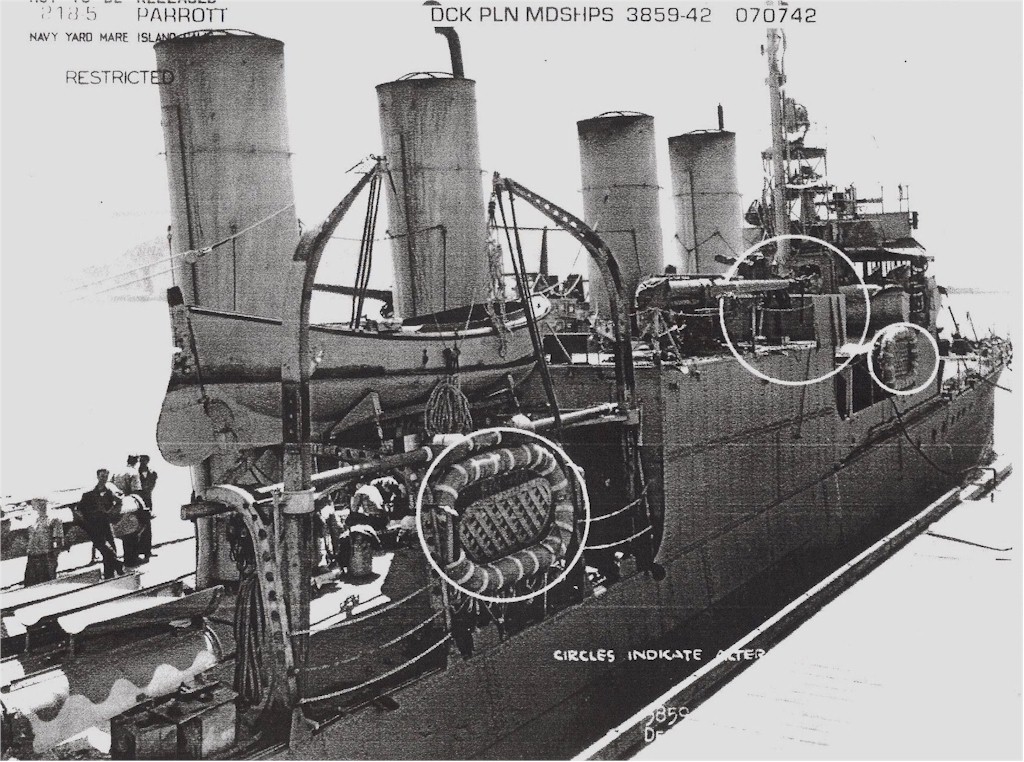 189k | Photos showing early war modifications to the Parrott as completed at Mare Island Navy Yard, 29 August 1942. These include: (1) removal of both aft banks of torpedo tubes and addition of two depth charge throwers to starboard and a single 20mm gun and splinter shield to port, (2) addition of two depth charge throwers just forward of the original depth charge racks, at the stern, (3) the addition of two 20mm guns and shields just aft of remaining starboard torpedo tube bank, where the boat used to be carried, and (4) the engine room sky-lights between the torpedo tube launchers, the former position of the aft stack, which has been removed, along with one boiler, below decks. The inboard ship is the USS Bulmer (DD-222). | Darryl Baker |