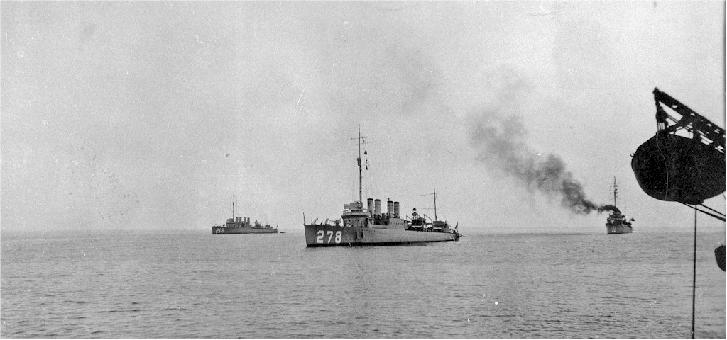 | 131k | USS Henshaw (DD-278) at anchor with other destroyers, circa 1920-21. USS Parrott (DD-218) is at left.