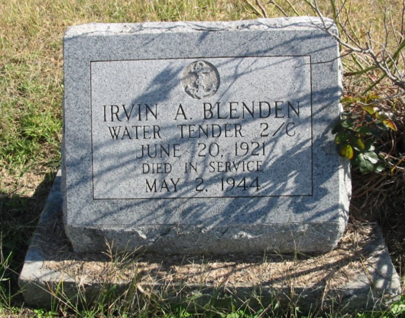 | 149k | Irvin Alfred Blenden was born in Kansas 20 June 1921. He enlisted in the Naval Reserve at Kansas City, MO, 10 February 1942. Reporting to Parrott 04 December 1942, he was promoted to Water Tender 2nd Class 01 May 1944. The next day, Blenden was serving as "oil king" in the forward engine room of Parrott when she was rammed by SS John Morton. Immediately prior to the collision, Watertender Second Class Blender, hearing the emergency "full back" bell in the forward engine room, rushed to the forward fireroom, to see if oil suction had been lost. Suction had not been lost, but Watertender Second Class Blender acted on his own initiative without orders from any superiors, and as a result of his actions, lost his life. His complete disregard for his personal safety and his courageous action in entering the fireroom just prior to the collision, was an act in keeping with the highest traditions of the United States Naval Service.