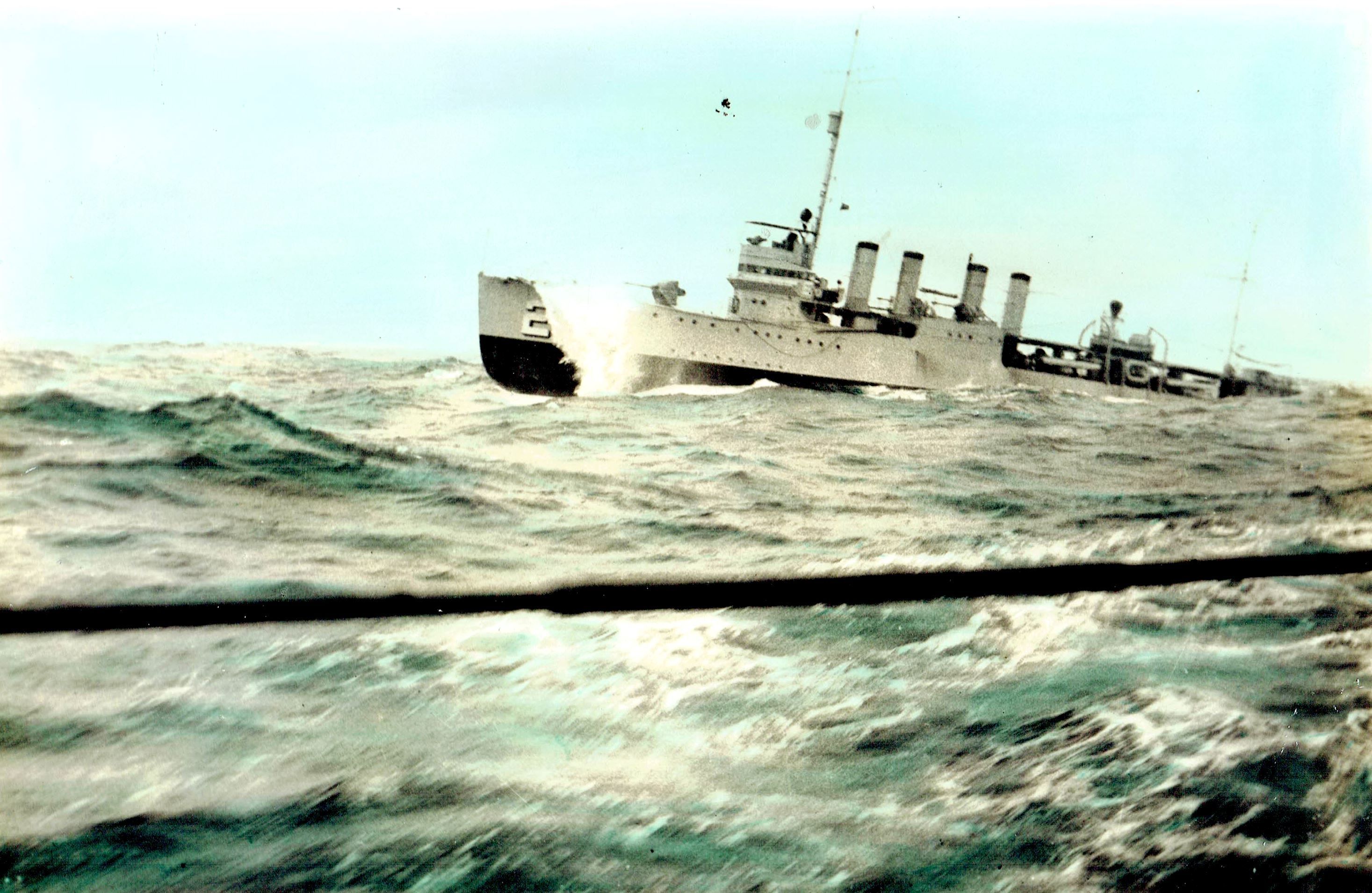 603k | Color or hand-tinted photo of Parrott at sea. The caption on the back reads: "Saturday, April 14, 1934. The Parrot [218] taking one over the bow en route to Yokohama from Manila; had about four days of this; was underway six days." | Jim Geldert, USNI |
