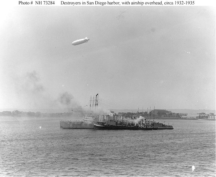 100k | Photo #: NH 73284, USS Barry (DD-248) nested with other destroyers in San Diego harbor, California, circa 1932-1935. Two fuel oil barges are moored alongside Barry. The airship in the distance is either USS Akron (ZRS-4) or USS Macon (ZRS-5). U.S. Naval Historical Center Photograph. | Paul Rebold |