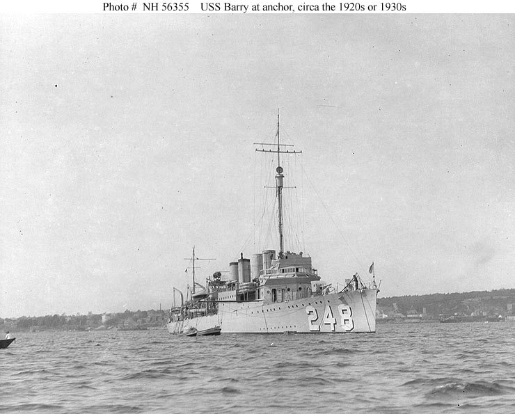 74k | Photo #: NH 56355, USS Barry (DD-248) at anchor, circa the 1920s or 1930s. U.S. Naval Historical Center Photograph. | Paul Rebold |