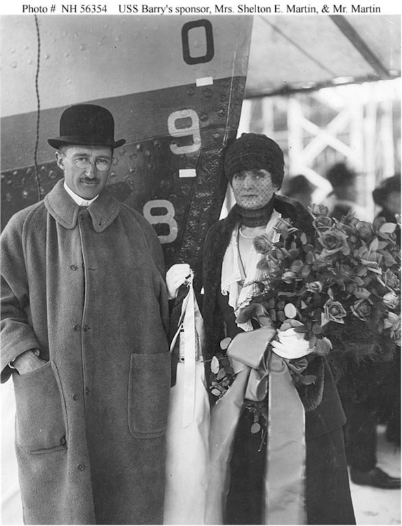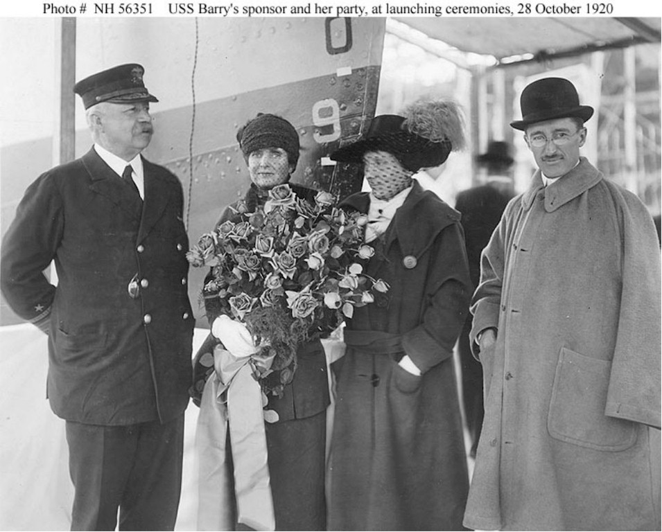 155k | Ship's Sponsor and her party during christening ceremonies at the New York Shipbuilding Corporation shipyard, Camden, New Jersey, 28 October 1920. Those present include (from left to right): Rear Admiral Reynold T. Hall, Inspector of Machinery at the shipyard; Mrs. Shelton E. Martin, Sponsor (Great grandniece of Commodore John Barry); Mrs. Reynold T. Hall; and Mr. Shelton E. Martin. U.S. Naval Historical Center Photograph. Photo #: NH 56351. | Robert Hurst |