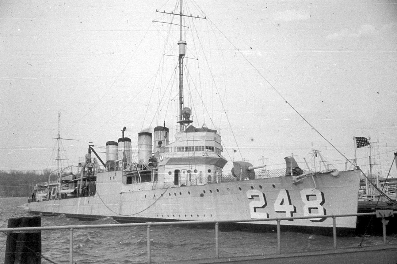74k | USS Barry (DD-248) and USS Borie (DD-215) as photographed from the USS Card (CVE-11) on 2 November 1943 in the Atlantic. The Borie (low in the water, right) sank shortly after being photographed due to severe bow damage sustained after ramming U-405 the night before (Treasure Island Museum-SFCB). Photo from Warship Boneyards, by Kit and Carolyn Bonner. | Robert Hurst |