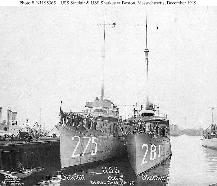 128k | USS Sinclair (DD-275) and USS Sharkey (DD-281) At Boston, Massachusetts, December 1919. Photographed by Crosby, Naval Photographer, 11 Portland Street, Boston. Note the crude identification numbers on the ship's bows, probably added after the photograph was taken. Courtesy of the Naval Historical Foundation. U.S. Naval Historical Center Photograph. | Fred Weiss |