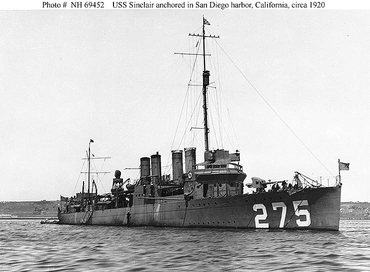 98k | USS Sinclair (DD-275) Anchored in San Diego harbor, California, circa 1920. Courtesy of ESKC Joseph L. Aguillard, USNR, 1969. U.S. Naval Historical Center Photograph. | Fred Weiss |
