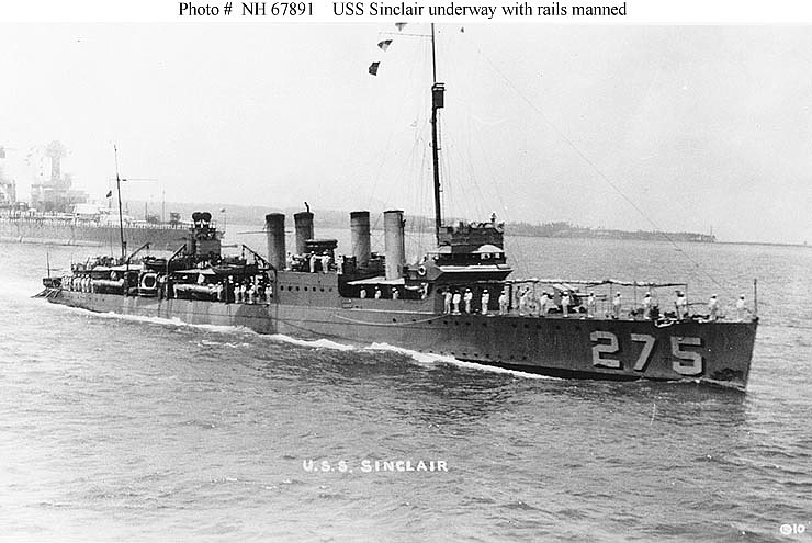 96k | USS Sinclair (DD-275) Underway in harbor, with her rails manned, during the middle or later 1920s. Courtesy of Donald M. McPherson, 1969. U.S. Naval Historical Center Photograph. | Fred Weiss |